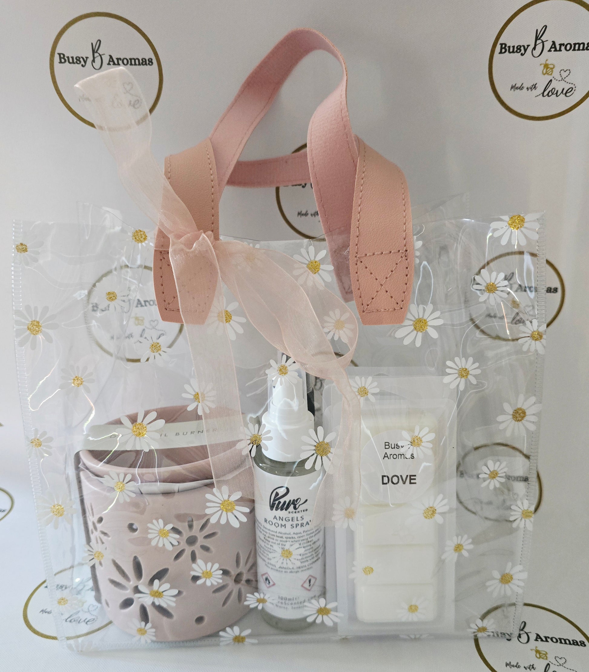 This expertly created wax melt gift set includes a stylish wax burner, eight tealights, and 3 scented wax snap bars & 2 (100ml) room sprays, all presented in a charming pink daisy print bag with handles. Perfect for creating a warm, inviting atmosphere, this set offers a complete aromatic experience ideal for gifting or personal indulgence.